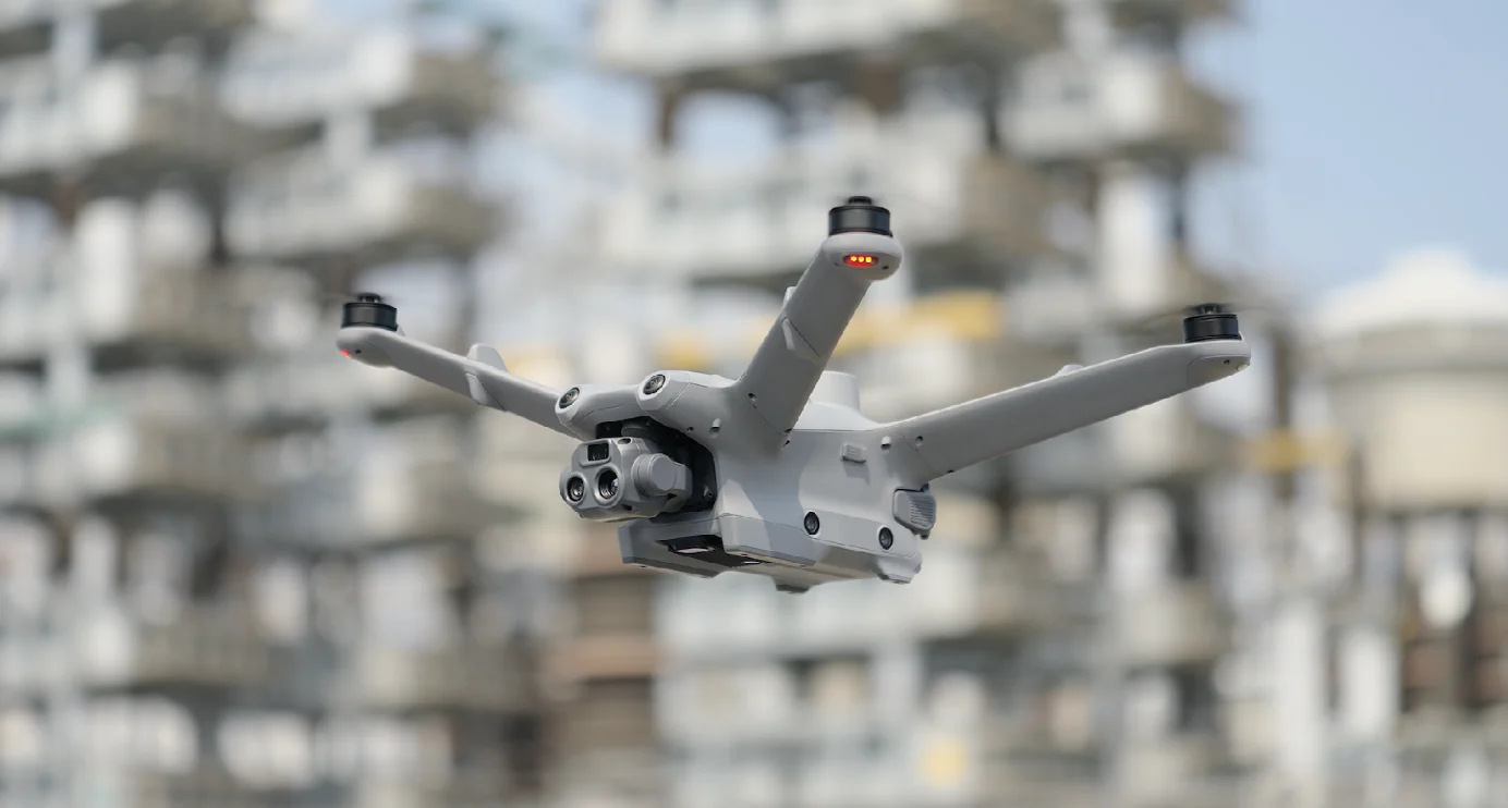 De Matrice 3TD is uitgerust met groothoek-, telefoto- en infraroodcamera’s, waardoor hij geschikt is voor beveiligings- en inspectiewerkzaamheden.